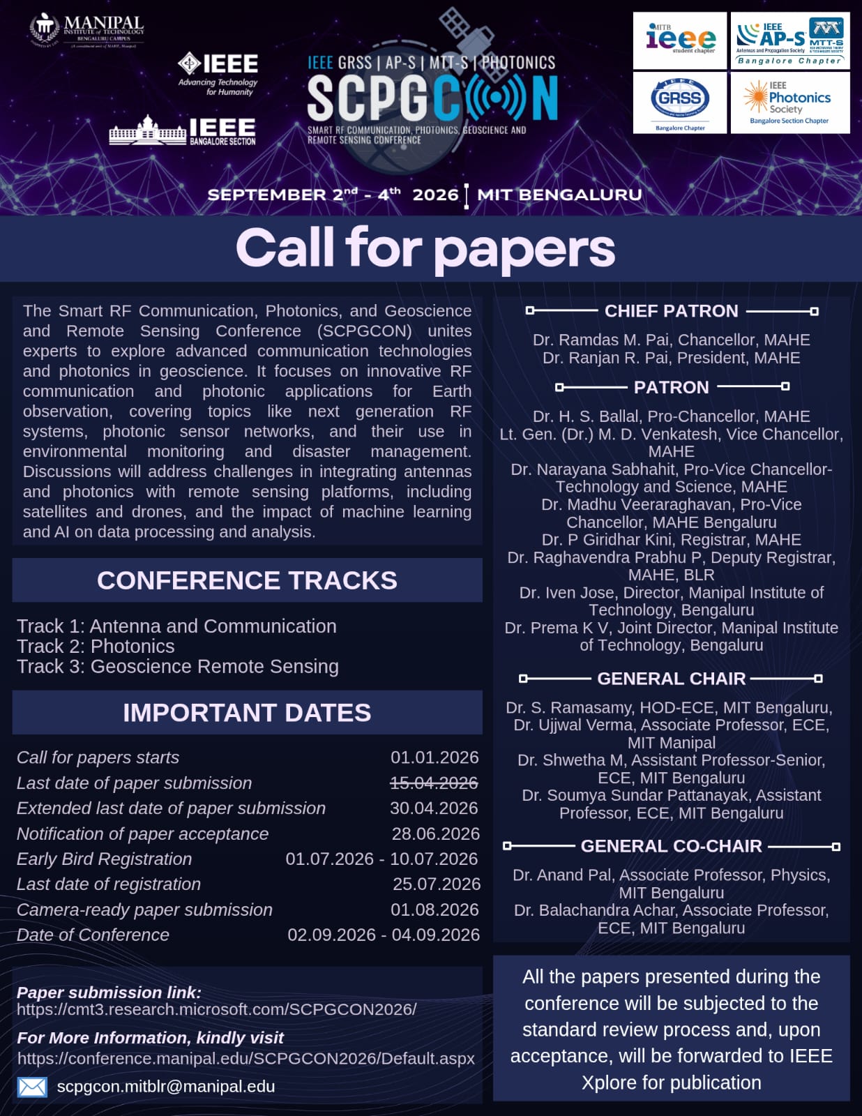 The Smart RF Communication and Photonics for Geoscience and Remote Sensing Conference (SCPGCON) aims to bring together experts from diverse disciplines to explore the integration of advanced communication technologies and photonics in the field of geoscience and remote sensing. This conference will focus on innovative applications of radio frequency (RF) communication and photonic systems in remote sensing technologies for Earth observation. Topics will include the design and deployment of next-generation RF communication systems, photonic sensor networks, and their role in environmental monitoring, disaster management, climate change studies, and resource management. The conference provides discussions on the challenges and future directions in the integration of antennas and photonics with remote sensing platforms, such as satellite systems, drones, and ground-based systems. Furthermore, the conference will delve into the role of machine learning and artificial intelligence in enhancing remote sensing data processing and analysis. Researchers and industry professionals will have the opportunity to discuss the latest technological advancements, explore interdisciplinary collaborations, and identify future research directions for the development of smart remote sensing systems that can transform geoscience applications.